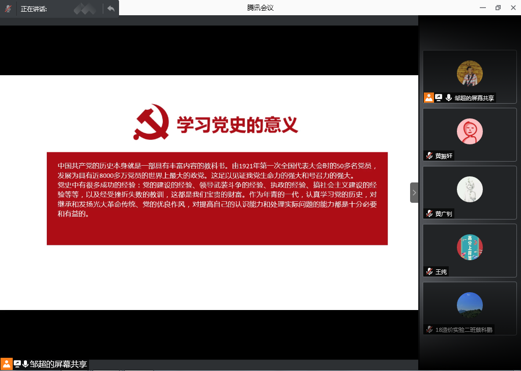 在党史学习会上,邹超同志强调学习党的百年历史,要以习近平总书记关于历史的重要论述为指导,要认真研读党史基本著作,全面了解中国共产党百年奋斗的光辉历程和历史性贡献,做到学懂弄通做实。随后,他从新民主主义革命时期、社会主义革命和建设时期、改革开放和社会主义现代化建设新时期三个部分入手,讲述了历史事实雄辩的告诉我们,没有共产党就没有新中国,只有社会主义才能救中国,只有改革开放才能发展中国,发展社会主义,发展马克思主义,只有中国共产党才是中国特色社会主义事业的坚强领导核心。会后毕业生党员们积极交流学习心得,大家均表示作为新时代的新党员,应当认真学习党的历史,继承和发扬革命传统、党的优良作风,这对提高个人认识能力和处理实际问题的能力都是十分必要和有益的,无论在哪里,何种实习岗位,都要持续学习党史,发挥党员先锋模范作用。